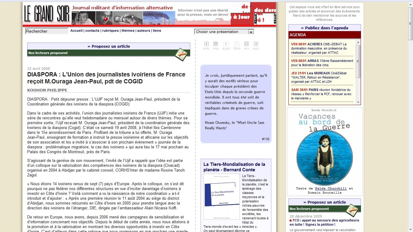Dans le cadre de ses activités, l’union des journalistes ivoiriens de France (UJIF) initie une série de rencontres qu’elle veut hebdomadaire ou mensuel autour de divers thèmes. Pour sa première sortie, l’Ujif recevait M. Ouraga Jean-Paul, président de la coordination générale des Ivoiriens de la diaspora (Cogid). C’était ce samedi 19 avril 2008, à l’hôtel Ibis Cambronne dans le 15e arrondissement de Paris. Profitant de la tribune a lui offerte, M. Ouraga Jean-Paul, enseignant de formation a instruit la presse ivoirienne et africaine sur les objectifs de son association et les a invité à s’associer à son prochain évènement « journée de la diaspora : problématique migratoire, le cas des ivoiriens » qui aura lieu le 17 mai prochain au Palais des Congrès de Montreuil, près de Paris.